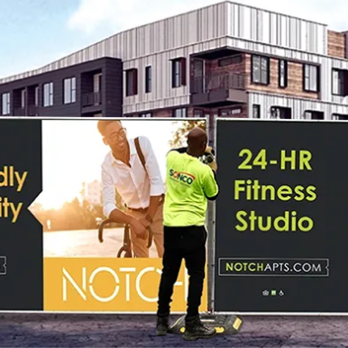 Milhaus attracts new residents by promoting property amenities on custom fence screens.