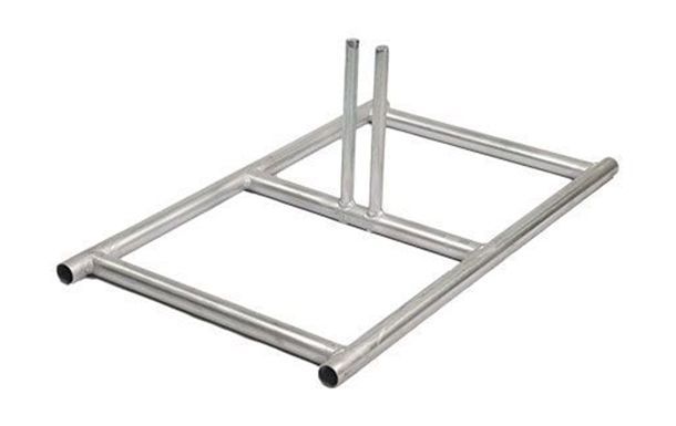 Each stand is built from 1-3/8" 16-gauge pre-galvanized pipe, welded into a flat, rigid base with two upright pegs. These peg supports connect two adjacent fence panels, with one stand placed between each pair. This metal base has a minimum order quantity of 50 units, with discount pricing available when you purchase 100 or more.